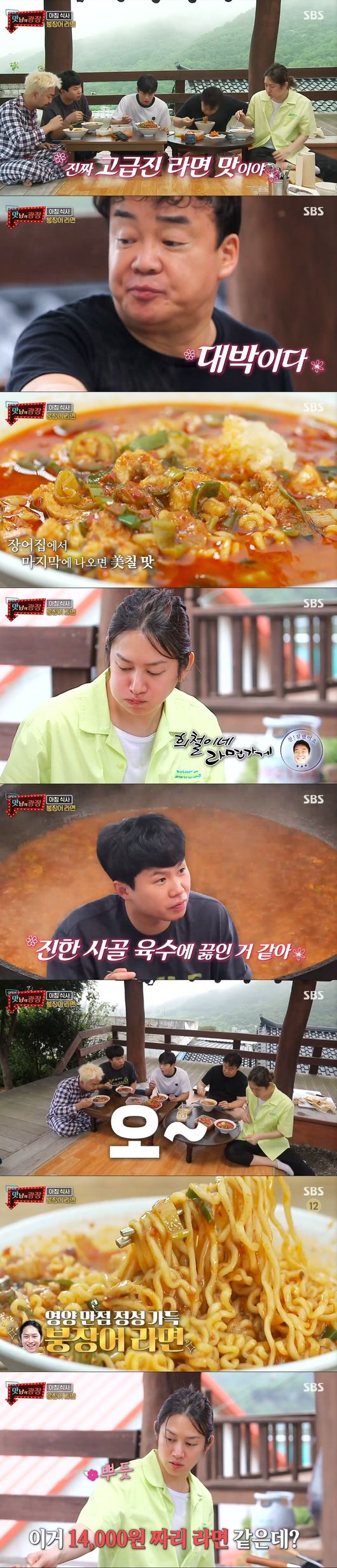 국물이 일품이라고. 모두 "다진마늘과 붕장어 국물이 환상조합이다, 진짜 고급진 맛"이라 감탄, 아이디어까지 예술이라며 칭찬세레를 이어갔다. 김희철은 "장인이 만든 라면느낌으로 만들었다"며 뿌듯해했다.