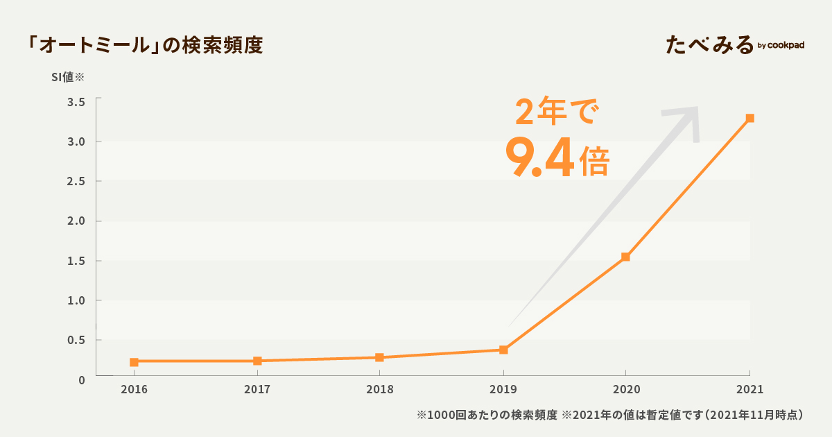 こうした中、米やパンの代替として低糖質の「オートミール」が注目されたとクックパッドは分析する。同社によると、「オートミール」のレシピ検索頻度は2019年からの2年間で9.4倍に伸長したという。